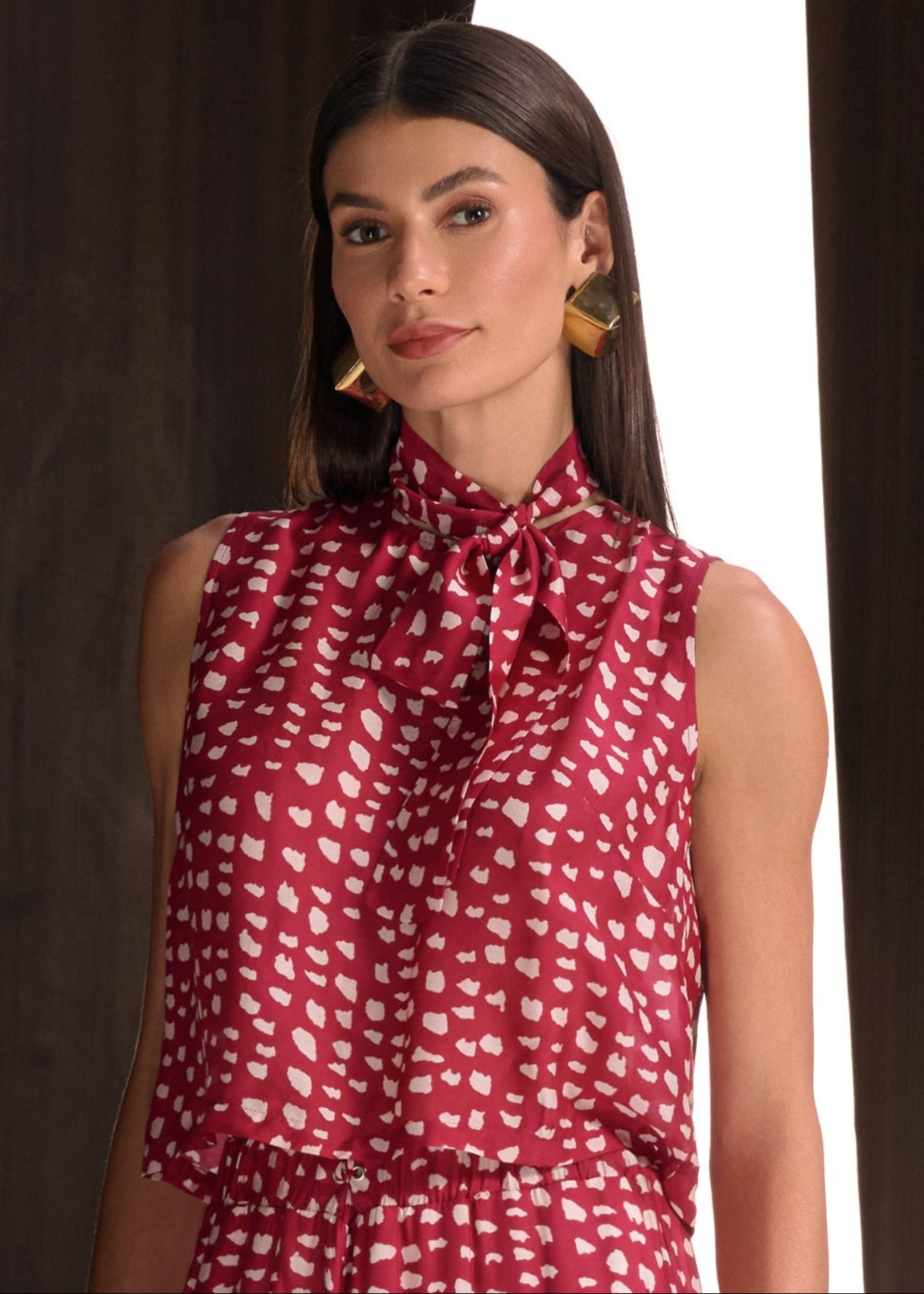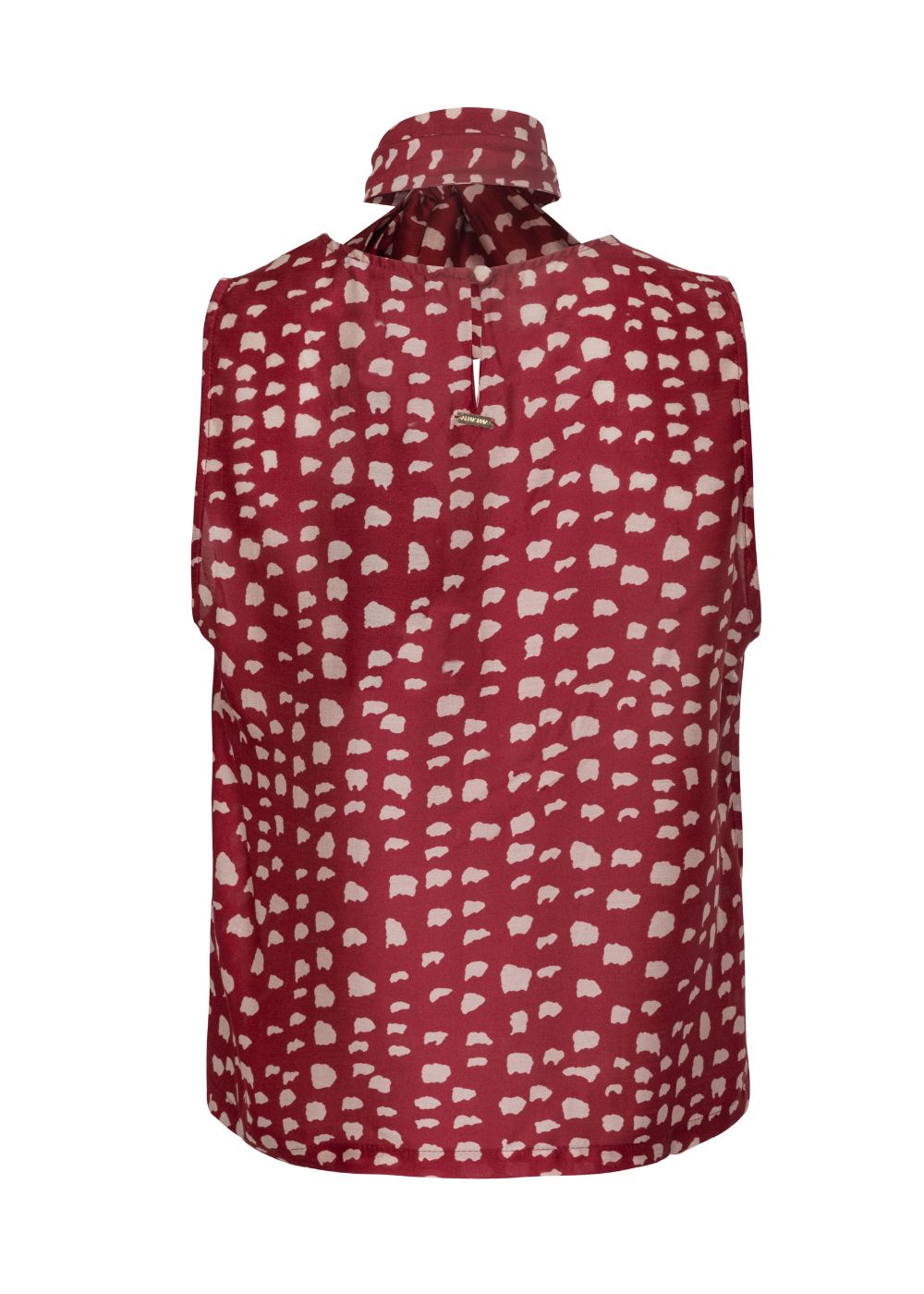 A blusa é confeccionada em tecido leve com estampa exclusiva Silk Fragmentos, possui modelagem solta ao corpo, sem mangas e gola alta com amarração, formando um laço delicado que valoriza o colo. O caimento fluido garante movimento e conforto, finalizando a peça com elegância contemporânea.