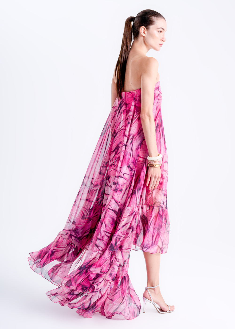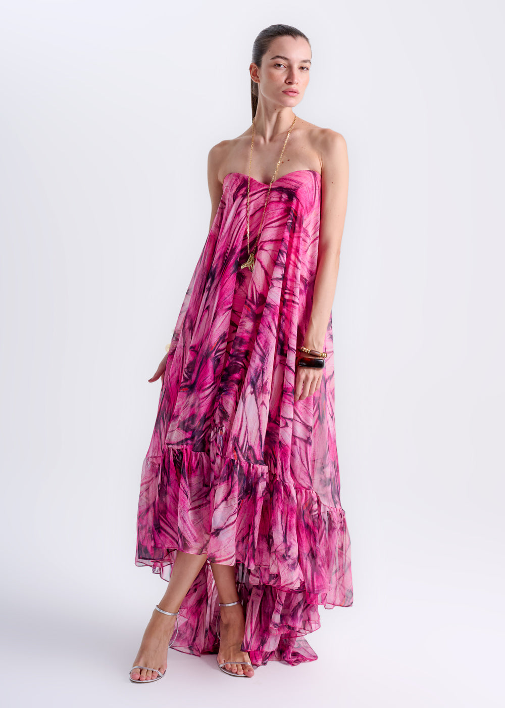 Vestido confeccionado em tecido leve. Decote levemente arredondado, tomara que caia e comprimento assimétrico.